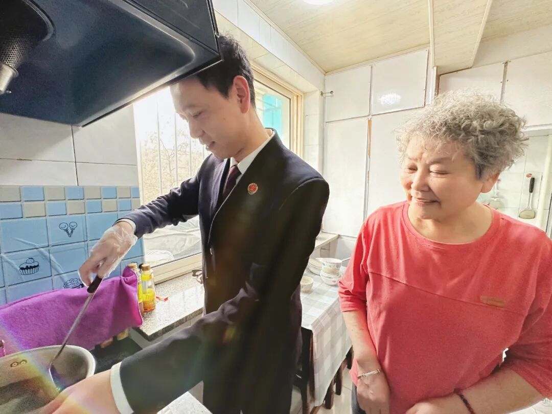 餐桌前,大家围坐一起,聊家常、话冷暖,干警详细询问了赵阿姨的身体情况、饮食起居和业余生活,同时,向赵阿姨介绍了检察院的具体职能。