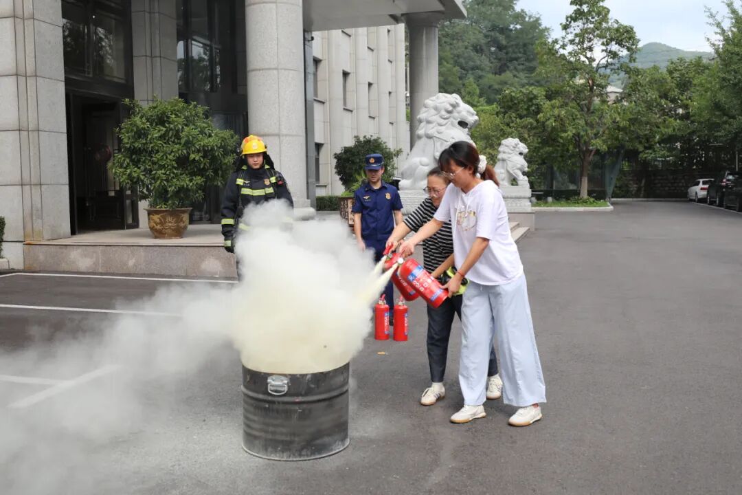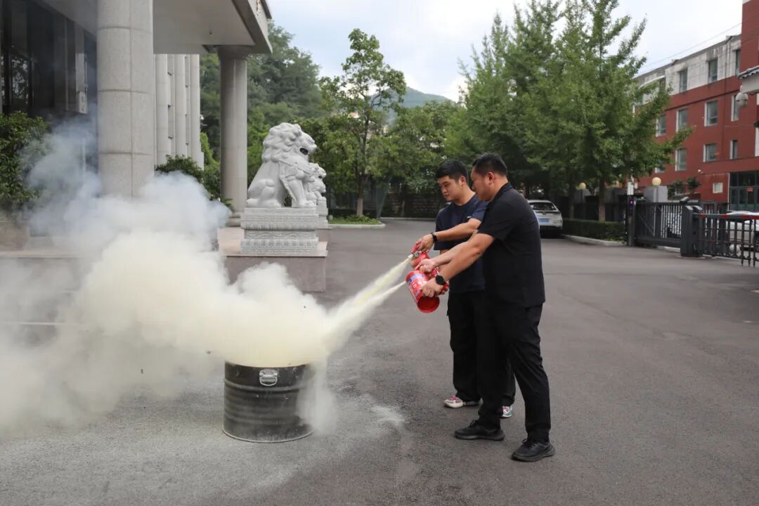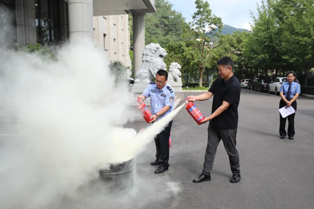 随着警报声响起,实战演练环节开始。面对疏散演练模拟的突发火情,全体人员迅速响应,按照既定疏散方案撤离至安全区域。过程紧张有序、操作规范,达到了预期效果。演练结束后,消防人员现场示范灭火器的使用要领,并指导参训干警操作消防器材现场灭火,让干警克服“纸上谈兵”的局限,提升初期火灾扑救和心理应对能力。