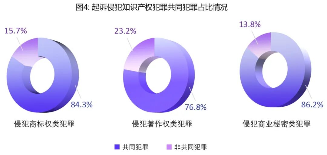 3.共同犯罪特征明显。起诉侵犯商标权类犯罪的17421人中,共同犯罪14687人,占比84.3%;起诉侵犯著作权类犯罪的2090人中,共同犯罪1606人,占比76.8%;起诉侵犯商业秘密类犯罪的225人中,共同犯罪194人,占比86.2%。